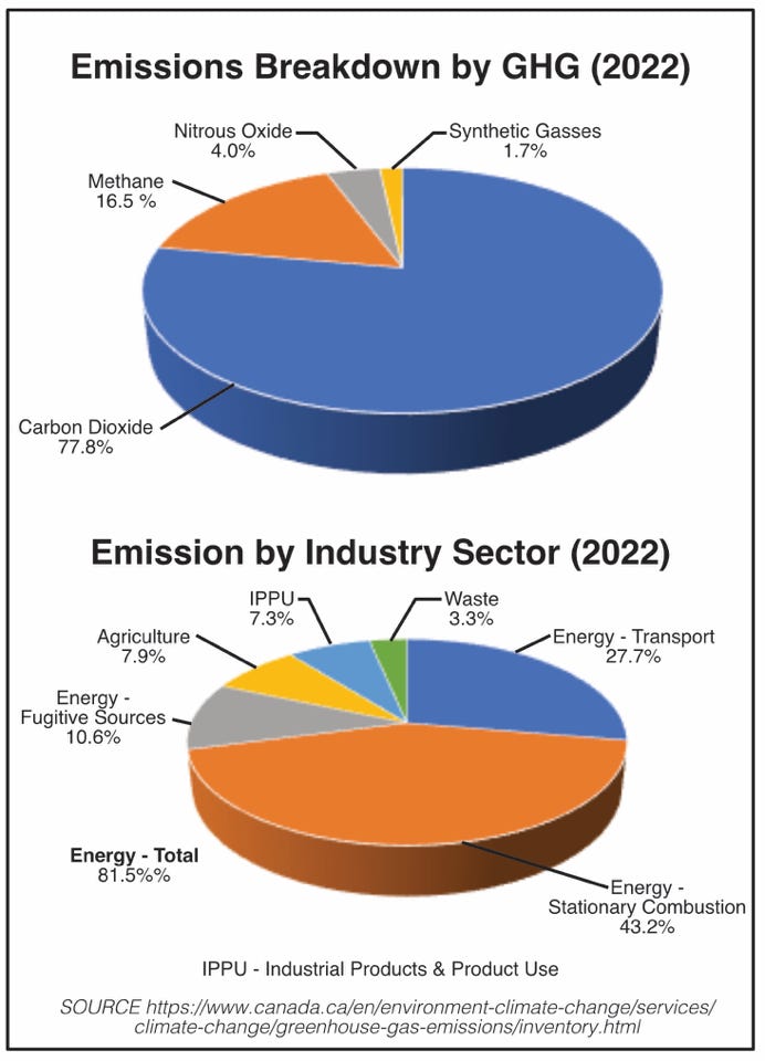 As the chart on the left shows, 81.5% of Canada’s greenhouse gasses are produced by carbon emitting industries, transportation (27.7%), stationary combustion sources such as power plants, industrial facilities and home heating (43.2%) and fugitive sources such as leaks and other irregular releases of gasses or vapours from pressurized containment (10.6%).