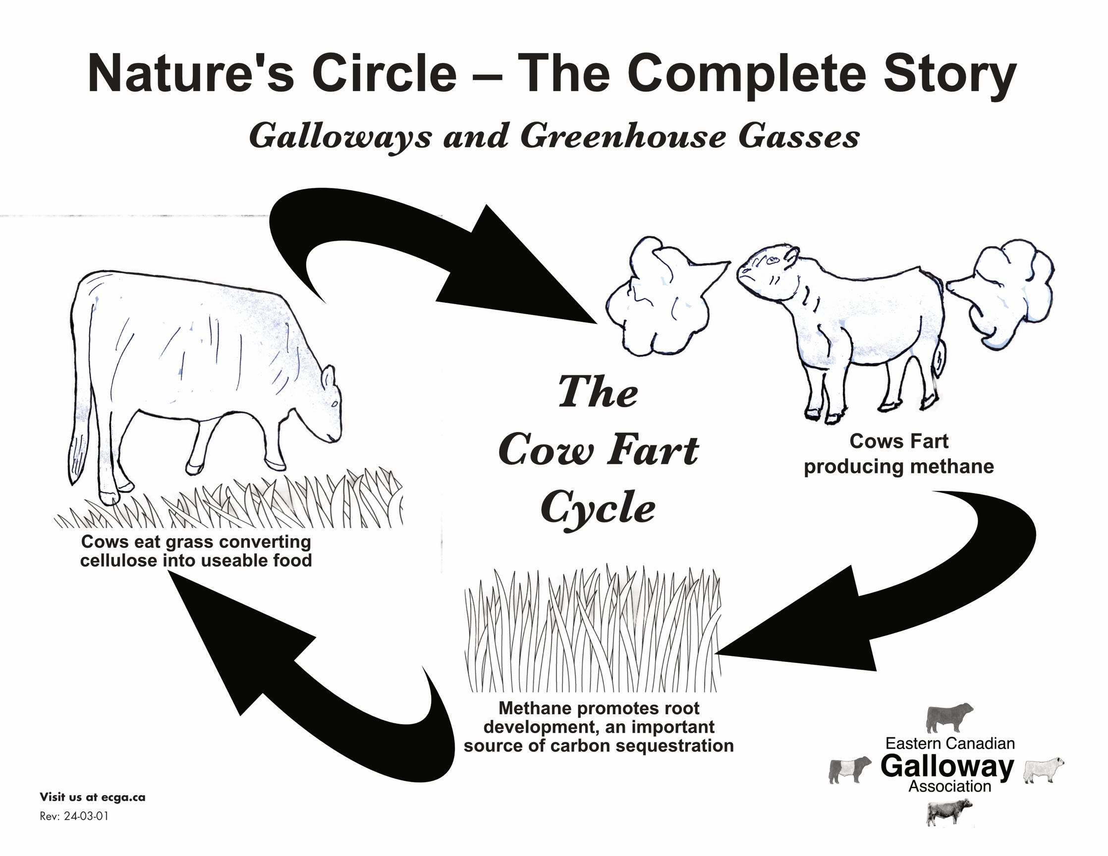Galloways and other ruminants don’t have to apologize for the methane they produce. Ask your scientists to tell you the rest of the story! Farts and belches are part of nature’s cycle. The methane is absorbed by the grasses cattle eat.1